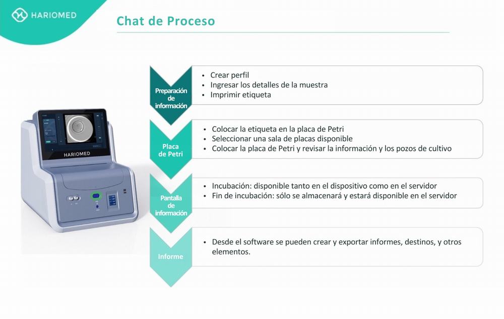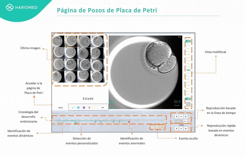 Monitorización Continua y No Invasiva: La tecnología Time-Lapse captura imágenes de los embriones a intervalos regulares (cada 10 minutos en 17 planos focales distintos) sin necesidad de retirarlos de la incubadora. Esto nos permite observar eventos críticos del desarrollo que antes podían pasar desapercibidos. Todo el proceso se gestiona a través de una pantalla táctil de 18.5 pulgadas que muestra el estado del cultivo en tiempo real.