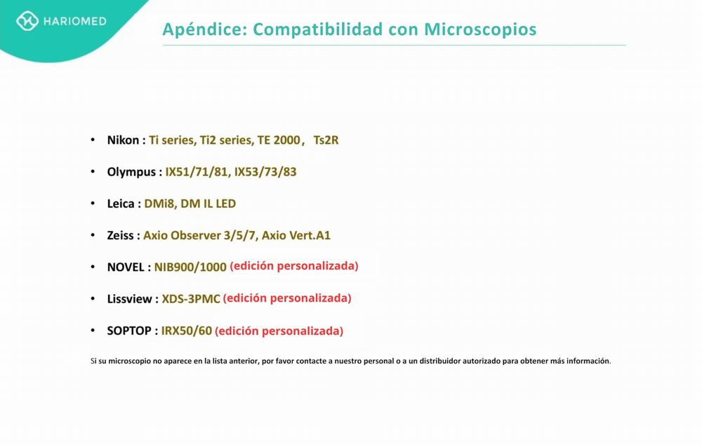 El panel de control multifuncional permite guardar hasta 5 configuraciones personalizadas, adaptándose a las necesidades de diferentes usuarios y procedimientos. Además, es altamente compatible con las principales marcas de microscopios del mercado como ZEISS, Leica, Nikon y Olympus, asegurando una integración perfecta en cualquier laboratorio.